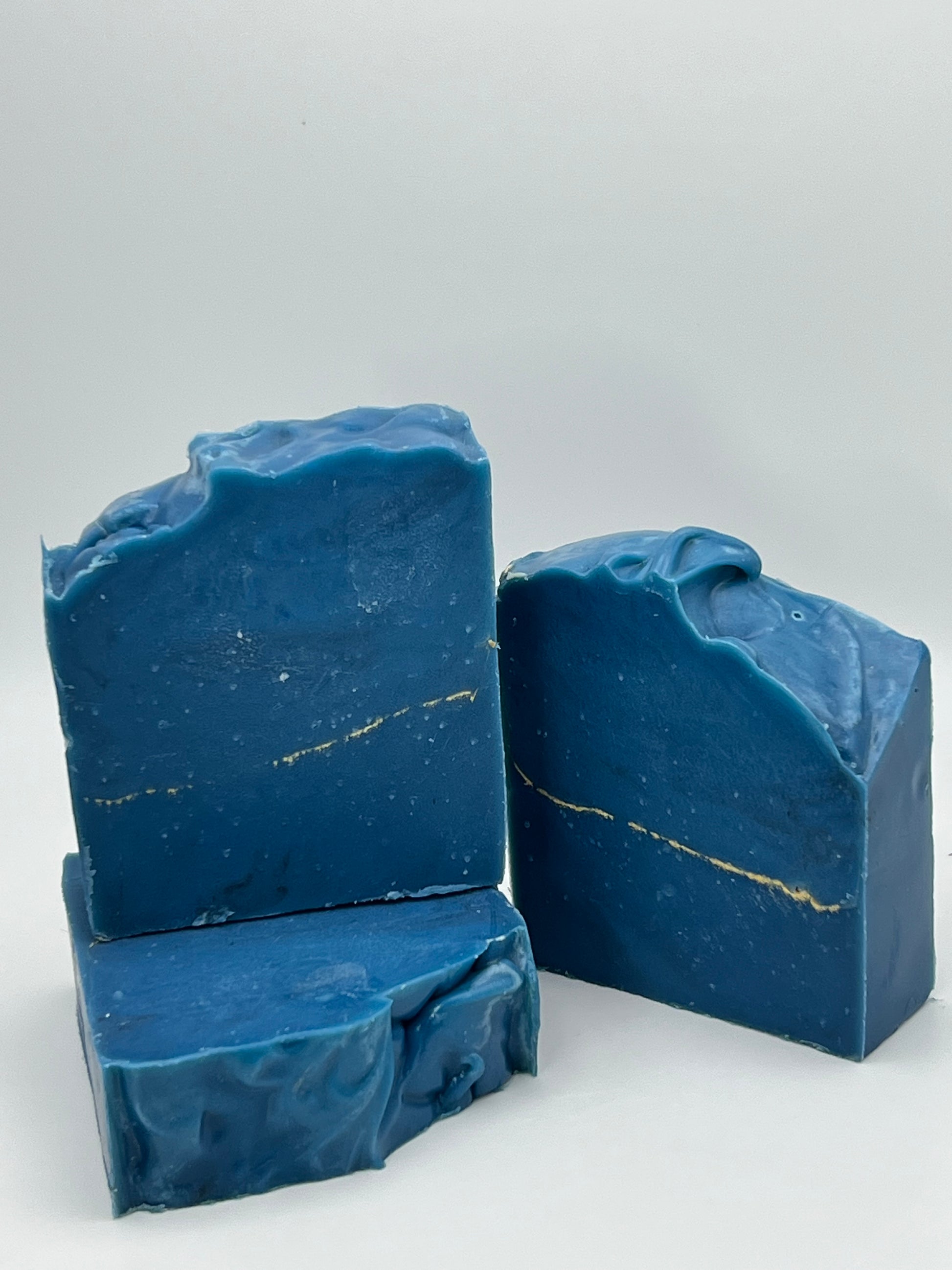 Triple Butter Bar Soap with a fine hint of a mica line to represent the horizon on a blue night! With a rich, moisturizing lather, the soothing fragrance of lavender and amber, along with bottom notes of musk, will help you shake off the day, and whisk you away to dreamland in no time.